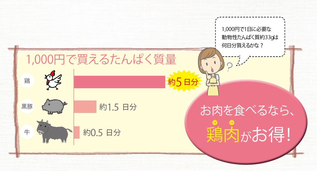 そんなお肉の中でも、脂質の種類を見てみると飽和脂肪酸が多い豚・牛に対して鶏肉は不飽和脂肪酸が多く、ヘルシー! しかも、断然お得なのです!