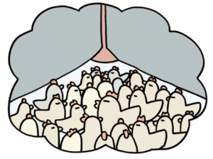 戦後、鶏卵や鶏肉が、その安さを競うコスト競争が激しさを増す中、大規模化が進行し、飼育環境の悪い、鶏の無理な詰め込み飼育が進められた現実がありました。