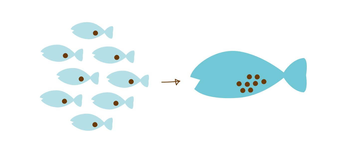 例えば、有害物質を蓄えた小さな魚を大きな魚が食べます。小さな魚を1匹食べるだけであれば、有害物質の量は1倍のままですが、それだけでは大きな魚のお腹を満たすことはできません。