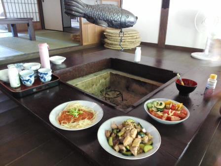 ご飯は薪で釜炊きです。水加減がなかなか難しいのですが、やっぱり釜炊きのご飯は最高!こんな暑い日でも食が進みます。おこげもちょっぴりできました。アコちゃん、初めて炊いたお釜のごはんを、「パシャッ」と撮影。