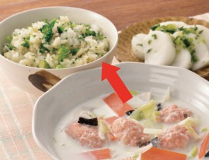 - フライパンにごま油を熱し、ブロッコリーと生姜を加えて炒める。醤油、みりん、胡麻を加え、炒め合わせたら、炊き上がったご飯に混ぜ込み、完成。