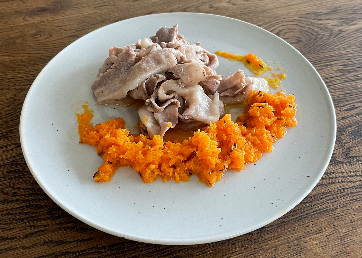 - 豚カタロースは解凍しておく。にんじんは皮ごとすりおろし耐熱皿に移し、塩とはちみつを加える。