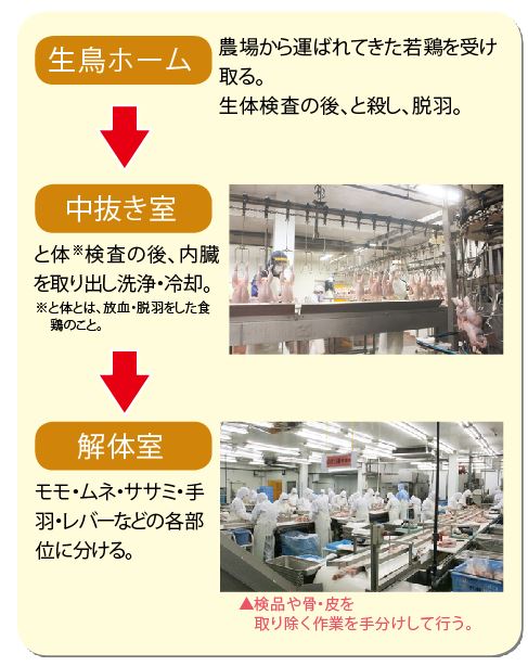 日々大量の若鶏をお肉やガラ、レバーなどの内臓まで、食べられるところは無駄なく切り分け出荷している陰には、おいしく食べてもらいたいという気持ちが。この気持ちをミート工場や冷凍食品工場へバトンタッチし、大切に製品を作ってお届けしています。