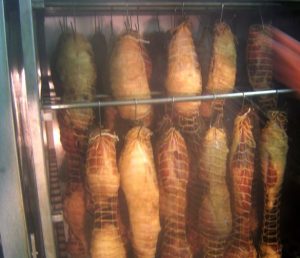 じっくり漬け込みが終わったら、塩抜きの後、専用のネットに入れて燻製をして仕上げます。
